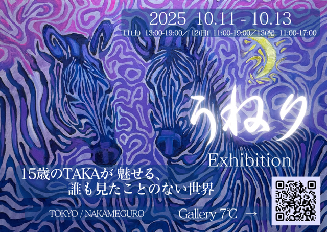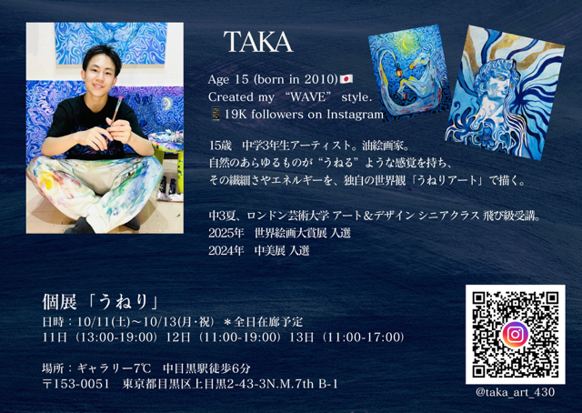 個展「うねり」 日時:10/11(土)~10/13(月・祝) *全日在廊予定11日(13:00-19:00) 12日(11:00-19:00) 13日(11:00-17:00)https://takaart.my.canva.site/ 2025年10月6日 投稿先 ART ← 過去の投稿へ